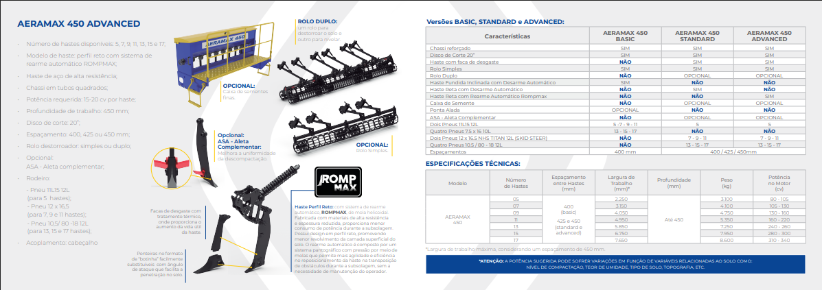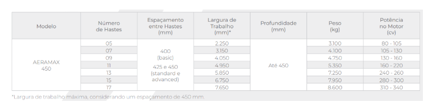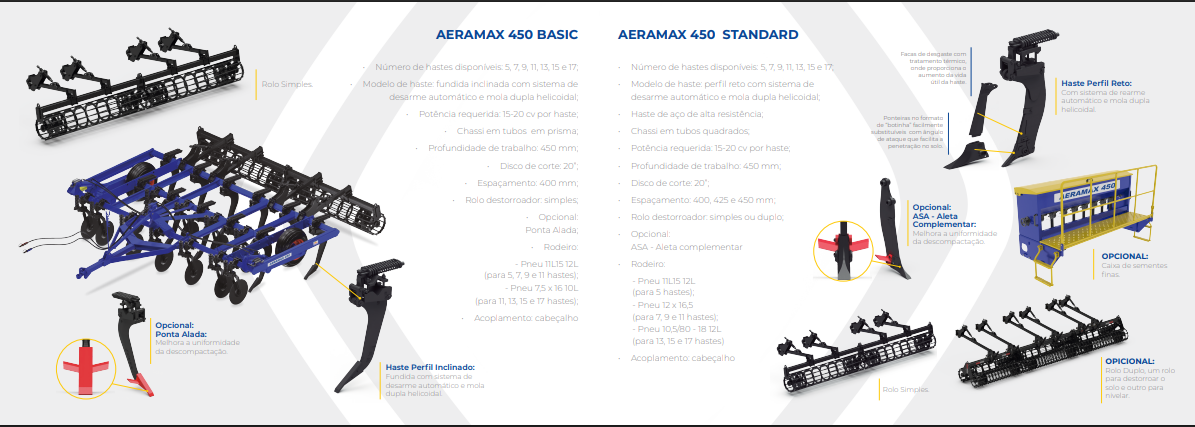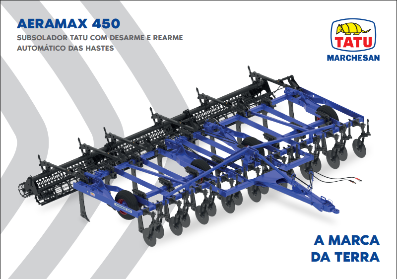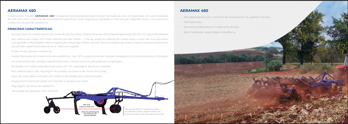 O subsolador, modelo AERAMAX 450, foi especialmente projetado para romper camadas do solo compactadas até a profundidade de 450 mm, com o mínimo de revolvimento superficial, maior segurança, agilidade e manutenção reduzida. Possui uma estrutura moderna e de grande resistência.