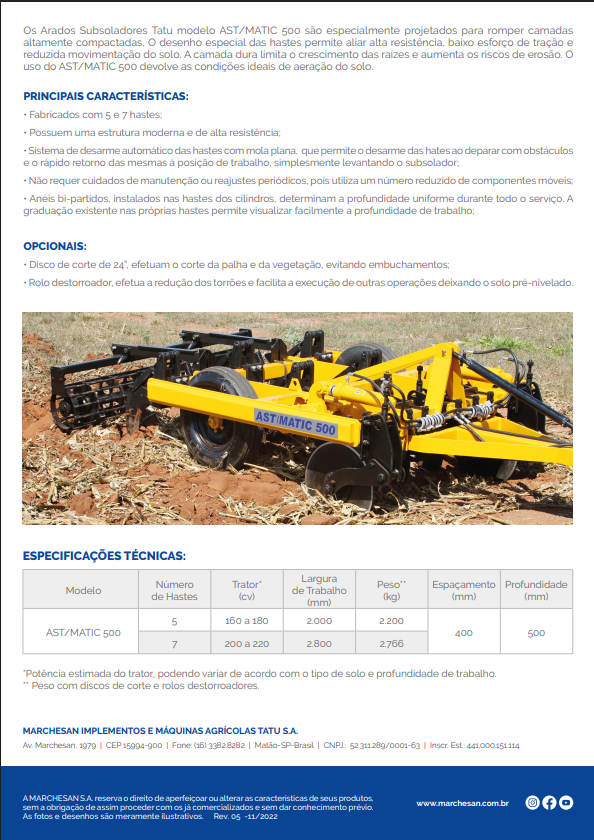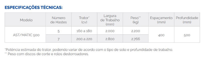 O AST/MATIC 500 possui uma estrutura moderna e de alta resistência. O desenho especial das hastes permite aliar alta resistência, baixo esforço de tração e reduzida movimentação do solo. A camada dura limita o crescimento das raízes e aumenta os riscos de erosão. O uso do AST/MATIC 500 devolve as condições ideais de aeração do solo.