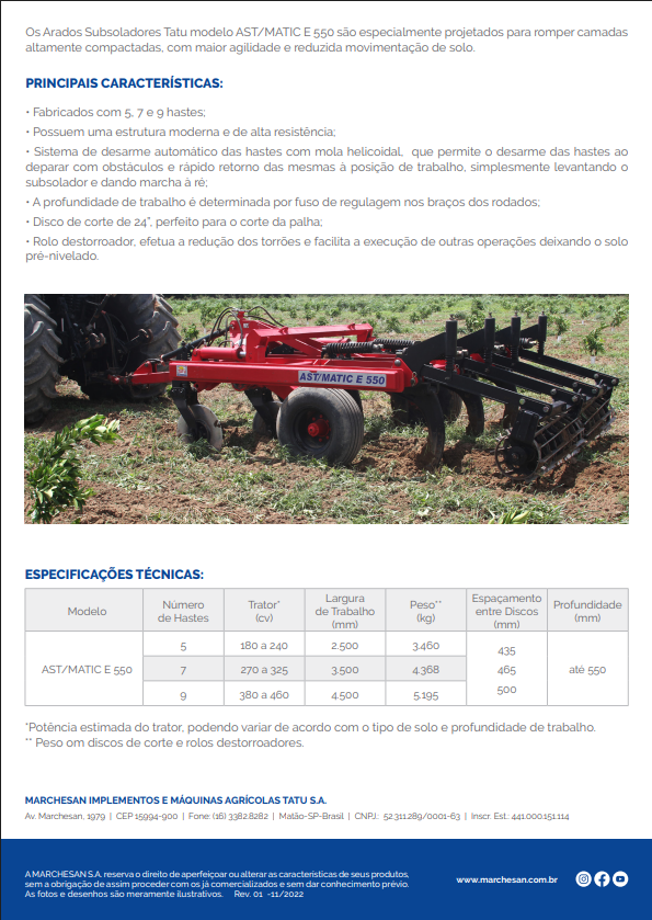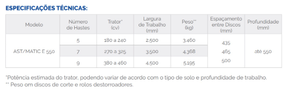 O AST/MATIC E 550 devolve as condições ideais de aeração do solo, especialmente no manejo com palha na superfície. Estrutura moderna e de alta resistência, com fácil ajuste do espaçamento entre hastes. O desenho das hastes permite aliar alta resistência e menor esforço de tração.