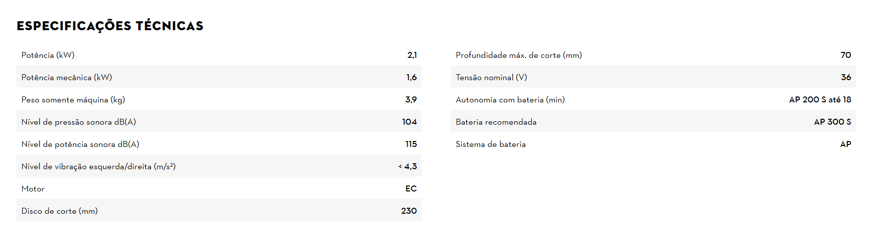 Com disco de 230 mm, o TSA 230 realiza cortes de até 70 mm de profundidade em materiais como tijolos, blocos, vergalhões, metais, perfis metálicos e compostos. Seu motor EC sem escovas ajusta automaticamente a potência conforme o material, garantindo máxima eficiência e durabilidade.