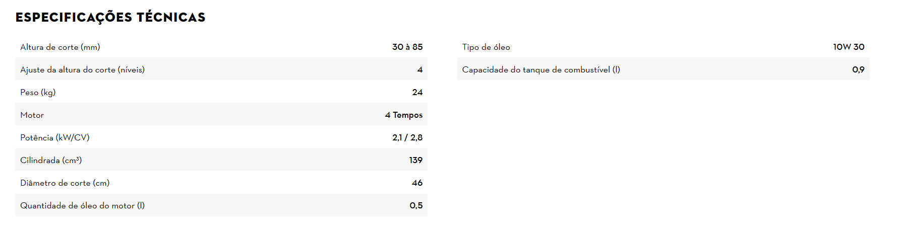 Com diâmetro de corte de 46 cm, o equipamento possui uma lâmina resistente com sistema de absorção de impactos, que protege o eixo de transmissão e o motor contra danos. A regulagem de altura de corte é manual e permite quatro posições entre 30 mm e 85 mm, adaptando-se facilmente às necessidades do usuário. O tanque de combustível tem capacidade de 0,9 litros e conta com excelente vedação, evitando vazamentos e contaminações. Já o bujão de óleo possui indicador de graduação para facilitar a verificação do nível e abastecimento correto.