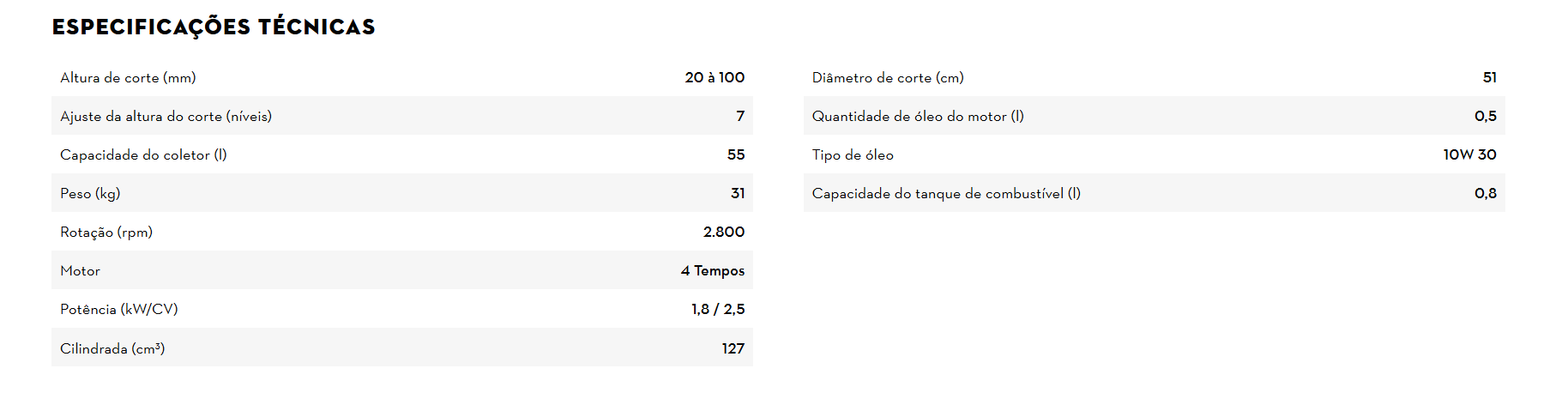 A lâmina de 51 cm realiza cortes limpos e consistentes, triturando a grama com eficácia. O sistema de absorção de impactos protege os componentes internos, prolongando a durabilidade do equipamento. A regulagem de altura é feita de forma simultânea nas rodas, com sete níveis entre 20 mm e 100 mm, permitindo ajustes rápidos conforme o tipo de terreno.