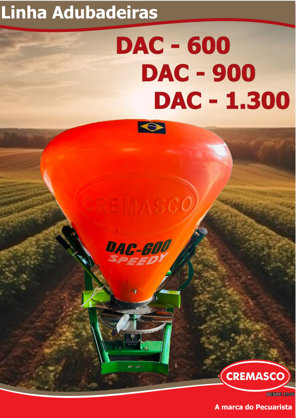 A adubadeira e semeadeira Cremasco DAC-1300-Speedy está entre as mais modernas do mercado, apresentando um sistema de distribuição absolutamente homogêneo e uniforme, com 18 opções diferentes de pontos de regulagem, funcionando com igual eficiência nos mais variados tipos de adubos e sementes