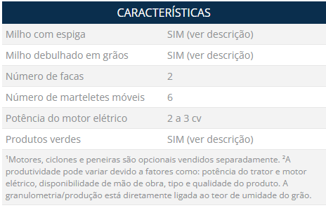 Aplicação: Moem milho seco em grãos, trituram milho em espigas, desintegram ou picam cana-de-açúcar, capim-elefante, mandioca, ramas e outros produtos verdes com qualidade superior.