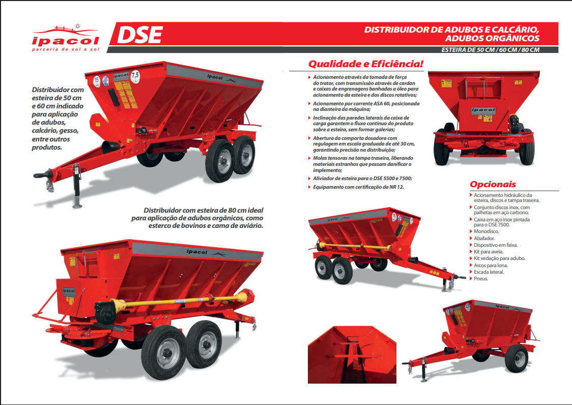 Distribuidor com esteira de 80 cm ideal para aplicação de adubos orgânicos, como esterco de bovinos e cama de aviário.