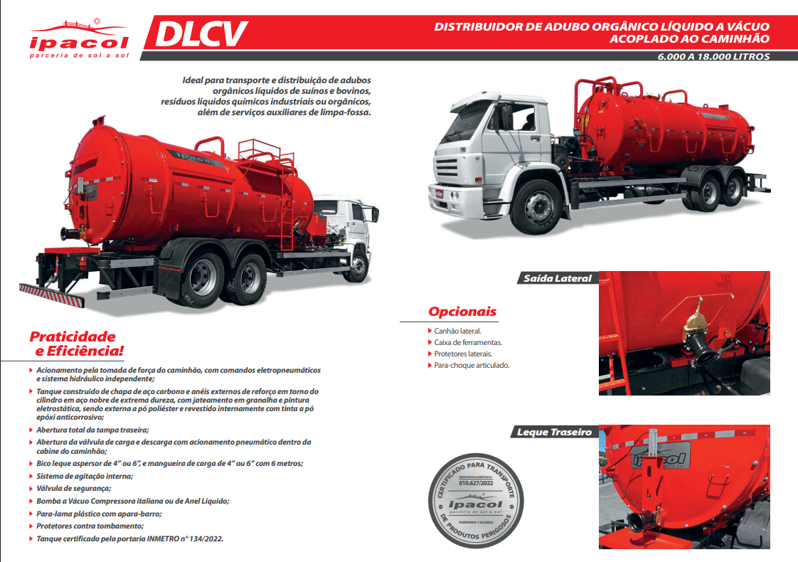 Ideal para transporte e distribuição de adubos orgânicos líquidos de suínos e bovinos, resíduos líquidos químicos industriais ou orgânicos, além de serviços auxiliares de limpa-fossa.