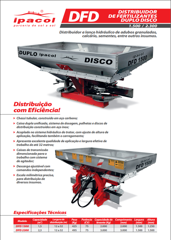 Distribuidor a lanço hidráulico de adubos granulados, calcário, sementes, entre outros insumos.