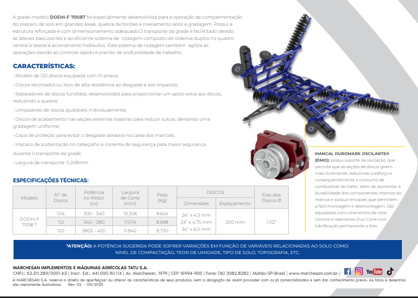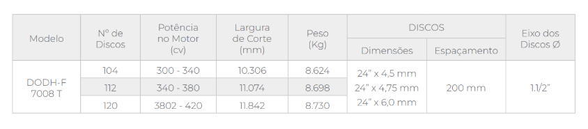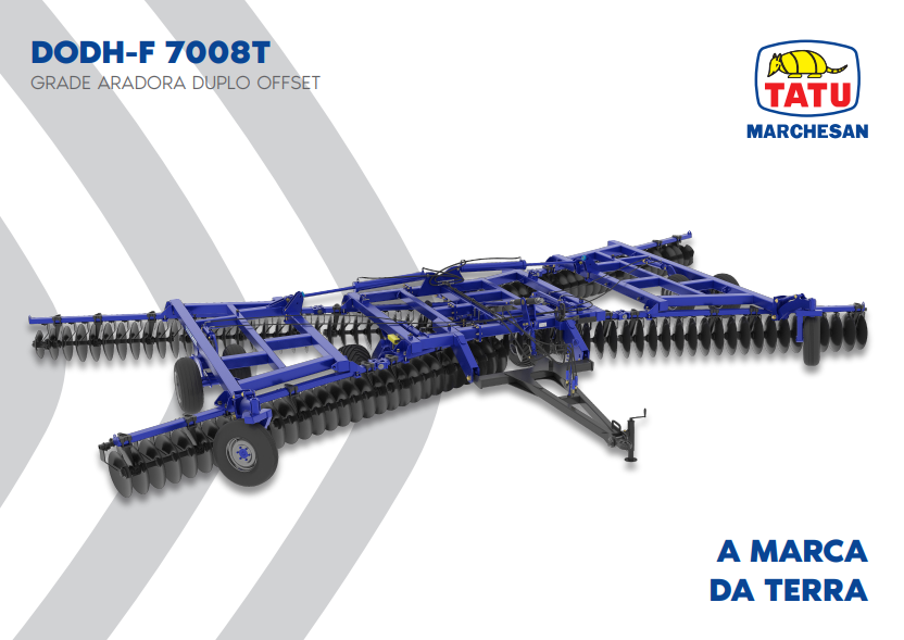 A grade modelo DODH-F 7008 foi especialmente desenvolvida para a operação de complementação do preparo de solo em grandes áreas, quebra de torrões e nivelamento após a gradagem. Possui a estrutura reforçada e com dimensionamento adequado.