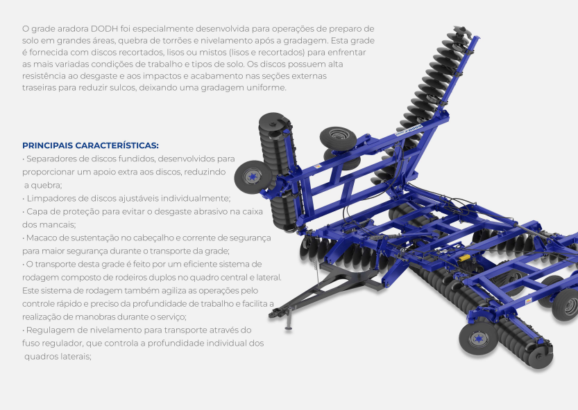 O grade aradora DODH foi especialmente desenvolvida para operações de preparo de solo em grandes áreas, quebra de torrões e nivelamento após a gradagem.