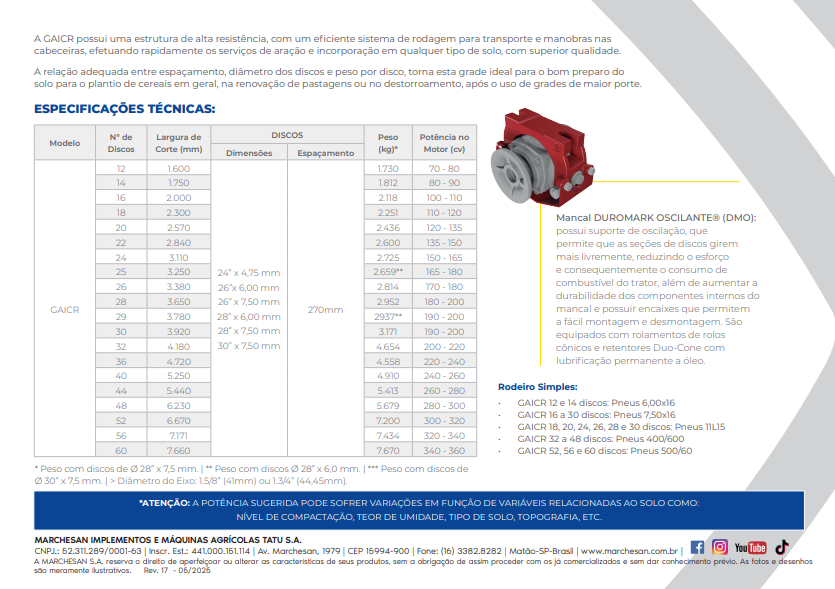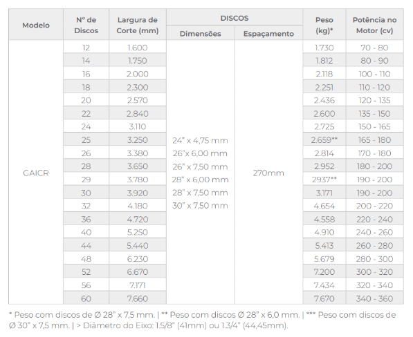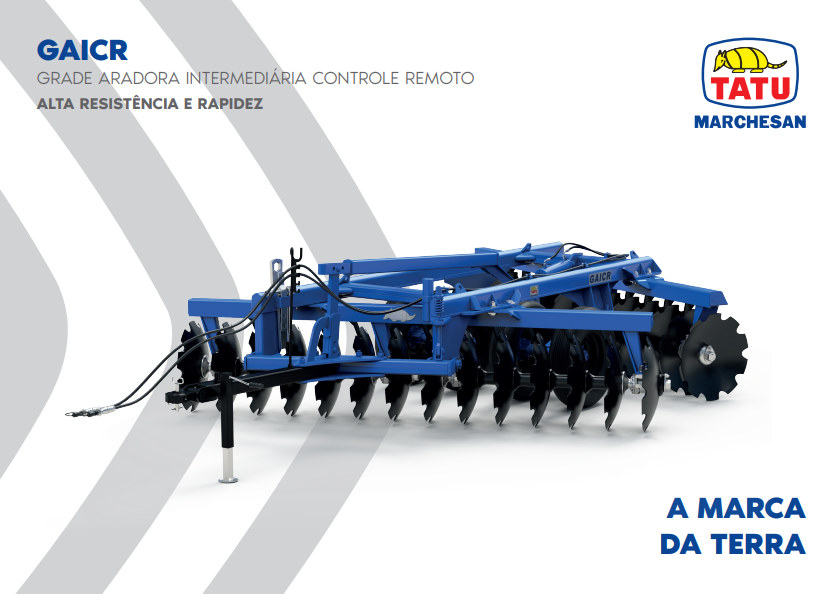 A GAICR possui uma estrutura de alta resistência, com um eficiente sistema de rodagem para transporte e manobras nas cabeceiras, efetuando rapidamente os serviços de aração e incorporação em qualquer tipo de solo, com superior qualidade. A relação adequada entre espaçamento, diâmetro dos discos e peso por disco, torna esta grade ideal para o bom preparo do solo para o plantio de cereais em geral, na renovação de pastagens ou no destorroamento, após o uso de grades de maior porte.