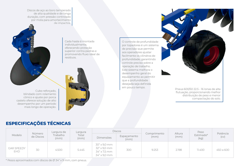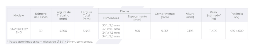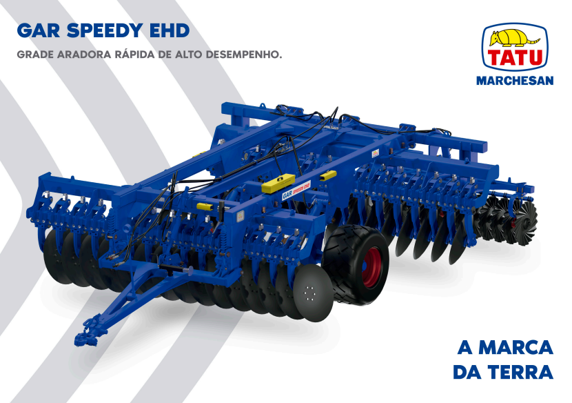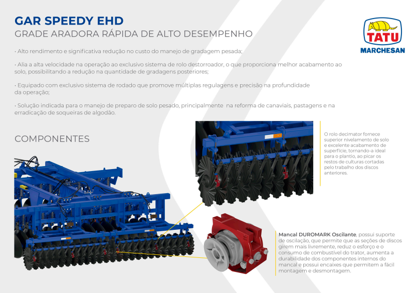 • Alto rendimento e significativa redução no custo do manejo de gradagem pesada; • Alia a alta velocidade na operação ao exclusivo sistema de rolo destorroador, o que proporciona melhor acabamento ao solo, possibilitando a redução na quantidade de gradagens posteriores; • Equipado com exclusivo sistema de rodado que promove múltiplas regulagens e precisão na profundidade da operação; • Solução indicada para o manejo de preparo de solo pesado, principalmente na reforma de canaviais, pastagens e na erradicação de soqueiras de algodão.