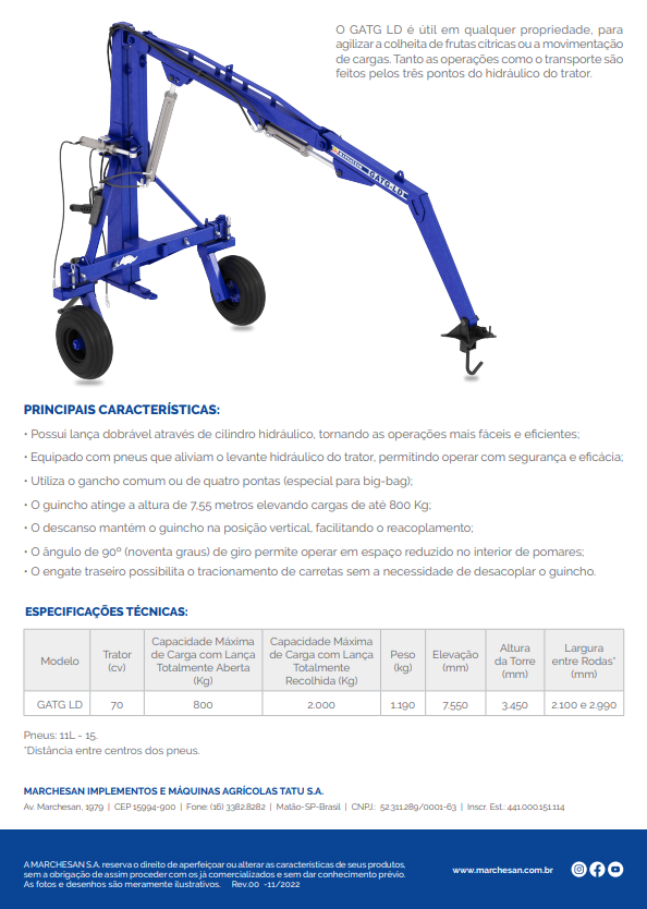 O GATG LD é útil em qualquer propriedade, para agilizar a colheita de frutas cítricas ou a movimentação de cargas. Tanto as operações como o transporte são feitos pelos três pontos do hidráulico do trator.