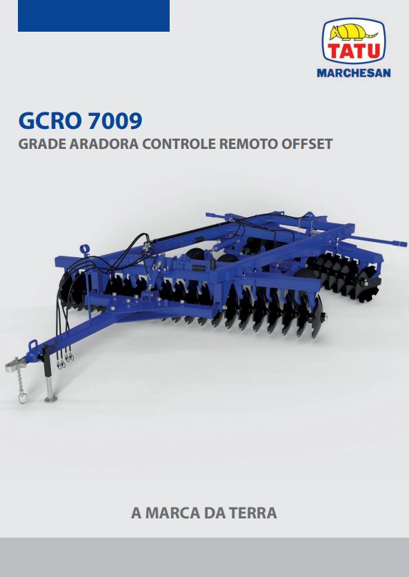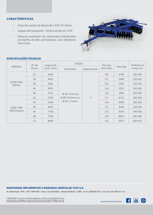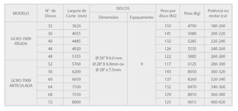 CARACTERÍSTICAS: • Eixos das seções de discos de 1.5/8” (41,3mm). • Largura de transporte – 52, 56 e 60 discos: 15’4”. • Mancais oscilantes de rolamentos lubrificados em banho de óleo permanente, com retentores Duo-Cone.