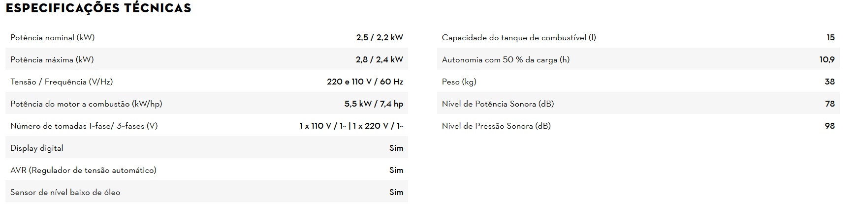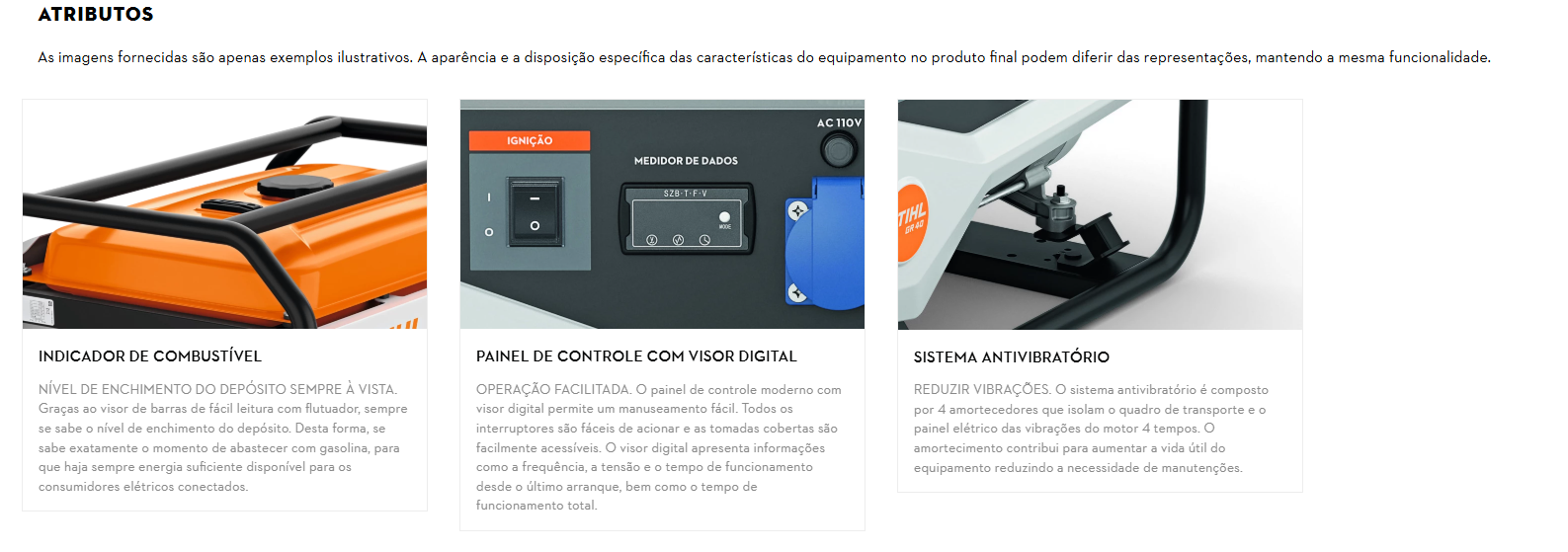 Apresentamos o Gerador STIHL GR 40, um equipamento compacto e versátil, ideal para pequenas aplicações em propriedades rurais, domésticos, seja em sítios, construções, acampamentos ou áreas sem acesso à rede elétrica, o GR 40 é a solução perfeita para garantir energia reserva em caso de falhas no fornecimento. Este gerador é equipado com um medidor digital que permite monitorar a tensão, frequência, tempo de funcionamento e total de horas trabalhadas. Para maior segurança, possui dois disjuntores: um específico para a tomada de 110V e outro que desarma automaticamente se a corrente ultrapassar o limite estabelecido. As tomadas monofásicas de 110V (azul) e 220V (preta) de 3 pinos com tampa de proteção evitam contatos acidentais e permitem selecionar a tensão desejada através de uma chave seletora. O GR 40 destaca-se pela sua alta durabilidade e pelo sensor de nível de óleo, que desliga automaticamente o motor quando o nível está baixo ou o gerador está desnivelado, prevenindo danos. Equipado com um motor de 4 tempos, oferece um baixo consumo de combustível e apresenta uma autonomia de até 11 horas com 50% de carga. Com capacidade de 15 litros no tanque de combustível, o gerador GR 40 possui um indicador de nível que facilita o controle do enchimento do tanque e garante máxima capacidade de produção de eletricidade sem interrupções. Além disso, o GR 40 fornece 2,5 kW de energia elétrica através de suas duas tomadas, sendo ideal para ligar diversos aparelhos elétricos. A regulação automática da tensão (AVR) assegura que a tensão se mantenha constante, independentemente do consumo dos aparelhos conectados. A proteção contra sobrecarga desativa o gerador caso o consumo combinado dos aparelhos exceda 2,5 kW. O Gerador STIHL GR 40 é montado em uma estrutura tubular de aço robusta, facilitando o transporte e garantindo durabilidade. Este gerador a gasolina é a novidade que vai proporcionar ainda mais liberdade e segurança para seus trabalhos com energia elétrica.