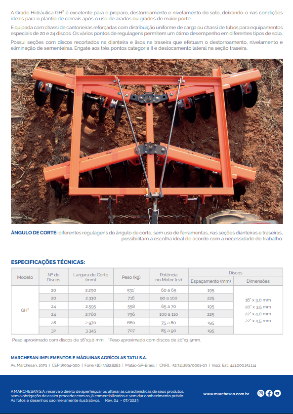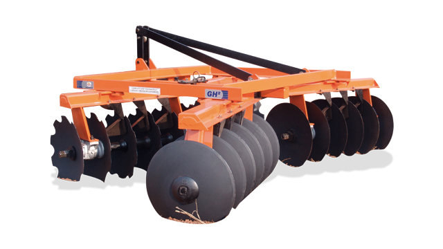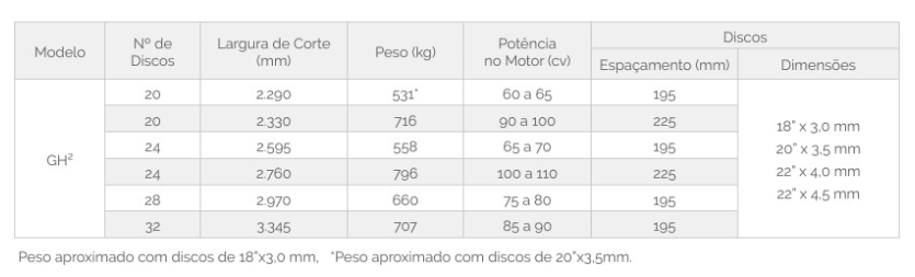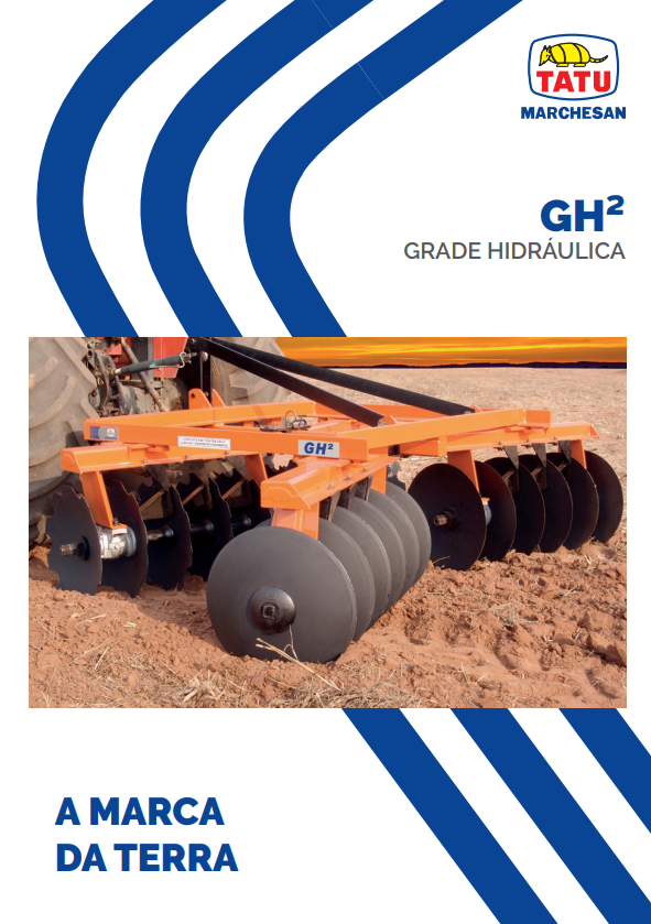GH² – Grade Hidráulica: excelente aplicação no preparo do solo para o plantio de cereais após o uso de arados ou grades de maior porte. Chassi de cantoneiras reforçadas com distribuição uniforme de carga. Os vários pontos de regulagens permitem um ótimo desempenho em diferentes tipos de solo. Seções com discos recortados na dianteira e lisos na traseira efetuam o destorroamento, nivelamento e eliminação de sementeiras. Engate aos três pontos categoria II.