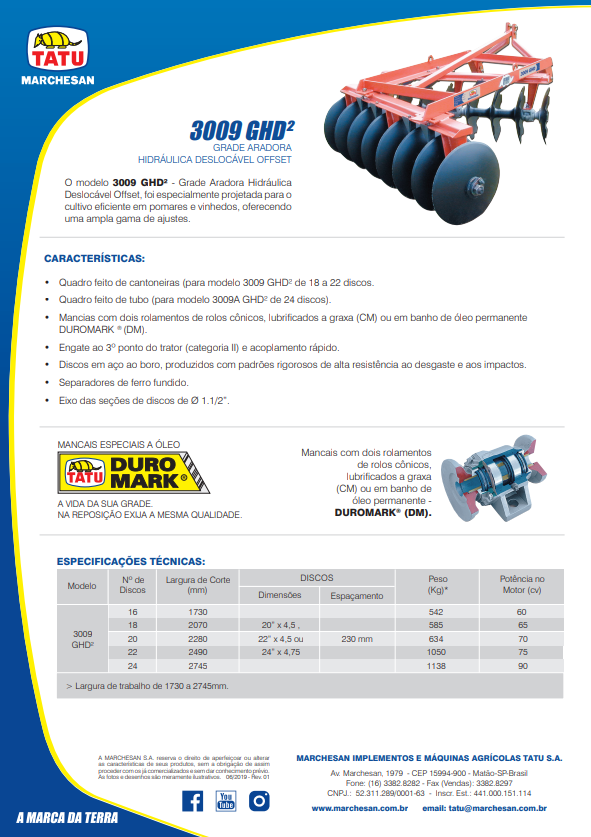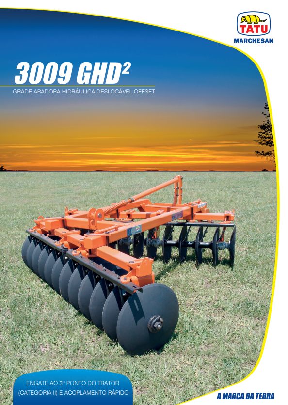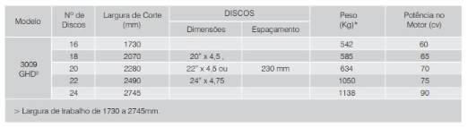 O modelo 3009 GHD² /n – Grade Aradora Hidráulica Deslocável Offset, foi especialmente projetada para o cultivo eficiente em pomares e vinhedos, oferecendo uma ampla gama de ajustes. /n – Quadro feito de cantoneiras (para modelo 3009 GHD² de 18 a 22 discos. /n – Quadro feito de tubo (para modelo 3009A GHD² de 24 discos). /n – Mancias com dois rolamentos de rolos cônicos, lubrificados a graxa (CM) ou em banho de óleo permanente DUROMARK ® (DM). /n – Engate ao 3º ponto do trator (categoria II) e acoplamento rápido. /n – Discos em aço ao boro, produzidos com padrões rigorosos de alta resistência ao desgaste e aos impactos. /n – Separadores de ferro fundido. /n – Eixo das seções de discos de Ø 1.1/2”.