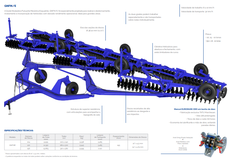A GNFM/E realiza o destorroamento, nivelamento e incorporação de herbicidas com elevado rendimento operacional. Ideal para grandes áreas..