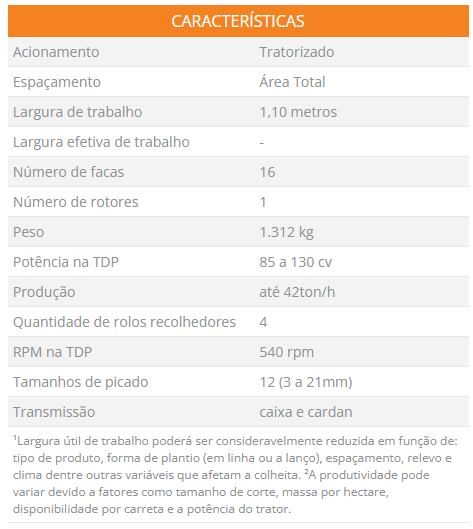 Colhedora de forragem de área total para cultura de verão e inverno com , largura máxima de trabalho de 1,10m, colheita para plantio a lanço ou em linhas, em qualquer direção, colhe sistema consorciado, construída e dimensionada com maior resistência para trabalho pesado, acionamento por trator, equipado com dois tambores recolhedores com discos de facas de alta velocidade em cada tambor, transmissão por coroa e pinhão com caixa blindada, 04 rolos internos sendo 02 rolos recolhedores, 01 liso e 01 móvel, rotor regulável com 16 facas em perfil “C”, processador de grãos +PRO removível, 16 lançadores, afiador com pedra retangular, contrafaca do rotor fixa com duas vidas, 04 limpadores por rotor, joystick para giro da bica e quebra jato, bica de saída em polietileno cross link com proteção interna, pé de apoio, alinhadores, quebra-jato, caixa de ferramentas, caixa da platafoma lubrificada a base de lítio, cobertura da transmissão em polietileno, transmissão por caixa e cardan, comando hidráulico completo (giro da bica e quebra jato), engrenagens com regulagem de tamanho de corte, 12 tamanhos de corte (3mm a 21mm), tombador, proteção traseira da caixa de transmissão, rotação requerida de 540 RPM na TDP e potência requerida na TDP de 85 a 130cv.