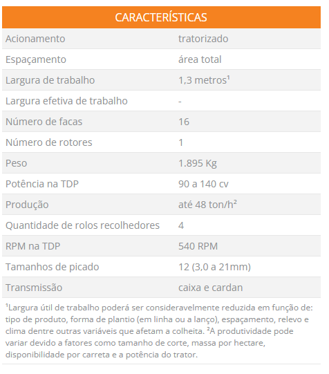 Colhedora de forragem de área total, para cultura de verão e inverno (milho, sorgo, capim, cana, aveia, dentre outros), colhe plantio a lanço ou em linha, em qualquer direção, colhe sistema consorciado, com 1,3 metro de largura de trabalho, equipado com 2 tambores recolhedores compostos de uma serra circular de alta velocidade em cada tambor, sistema de transmissão sem correia, transmissão dianteira por coroa e pinhão com caixa blindada, com 4 rolos internos sendo 02 recolhedores, 01 liso e 01 móvel, rotor regulável com 16 facas em perfil “C”, processador de grãos +PRO removível, 16 lançadores em cada rotor, engrenagens com regulagem de tamanho do corte, 12 tamanhos de picado variando de 3mm a 21mm, afiador com pedra retangular, contrafaca do rotor fixa com duas vidas, 02 limpadores por rotor, bica de saída em aço carbono e em inox na área de maior atrito, gota removível, quebra jato duplo, pé de apoio, cardan de acionamento, pontos de engate ao levante hidráulico, alinhadores, rolos recolhedores, tombador, bica de descarga, mecanismo de giro da bica, mecanismo de movimentação do quebra-jato, caixa de ferramentas, cardan de acionamento do rotor e rolos, serra de corte, transmissão por caixa e cardan, bica e quebra jato com comando hidráulico, roda de apoio, acople para colheita lateral, rotação na TDP de 540 RPM e potência requerida de 90 a 140 cv.