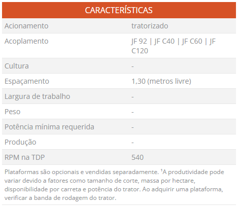 Descritivo técnico: Plataforma para corte e recolhimento de capim, trabalho em área total, com largura de trabalho de 1,3m, equipado com barra de corte com três discos de corte, lona de proteção, capas de proteção, eixo cardan de transmissão, caixa multiplicadora de transmissão, polias de transmissão, acoplável às colhedoras JF90, JF92, JF C40, JF C60 e JF C120 com transmissões por caixa/cardan ou polia/correia, rotação requerida na TDP de 540 RPM, potência requerida na TDP de 60 a 80 cv (a potência depende da máquina a ser acoplada).