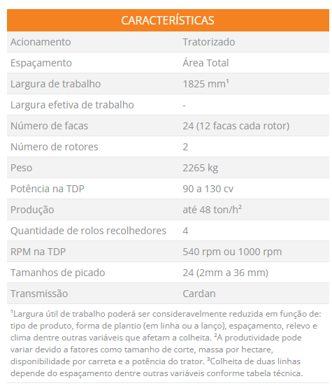 Colhedora de forragem de área total desenvolvida para colher e picar com precisão culturas forrageiras (milho, sorgo, capim, aveia e outras similares), independente de linha de plantio. Composta por uma plataforma com quatro tambores recolhedores frontais equipados com facas individuais, um braço articulável para acoplamento lateral ou traseiro ao sistema de levante hidráulico de três pontos do trator, uma roda de apoio para auxiliar o sistema hidráulico a sustentar o peso da máquina, sistema de transmissão por cardan, duas caixas alimentadoras com dois rolos frontais e dois traseiros, sendo um deles móvel, sistema de mudança de velocidade para variação do comprimento de corte, dois rotores picadores contendo doze facas cada um, bica de descarga giratória com acionamento hidráulico e duplo direcionador de jato de produto picado. Recomenda-se trator de categoria 2, com potência de 90 a 130cv na tomada de força (540 ou 1000rpm, conforme a versão da máquina). Variedade de tamanhos de corte disponíveis, sempre com alta precisão, graças à tecnologia de ponta empregada na máquina; 24 tamanhos de picado (2 a 36mm), bica de descarga e quebra jato controlados por joystick, proporcionando maior controle e precisão na operação.