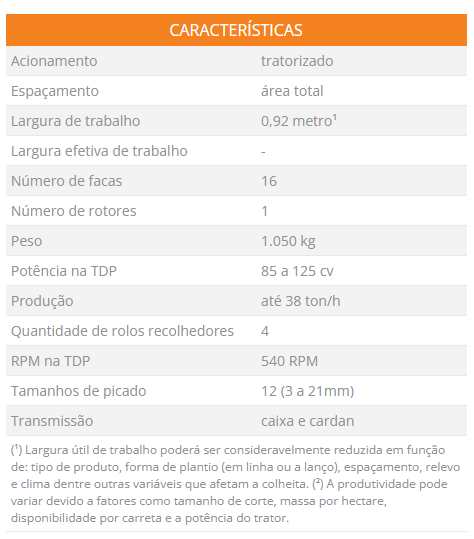 Colhedora de forragem em área total para corte, recolhimento e picado de cana-de-açúcar para forragem, extensivo a outras culturas de inverno e verão, largura máxima de trabalho de 0,92m, colheita para plantio a lanço ou em linhas, em qualquer direção, colhe sistema consorciado, construída e dimensionada com maior resistência para trabalho pesado, acionamento por trator, equipado com dois tambores recolhedores com discos de facas de alta velocidade em cada tambor, transmissão por coroa e pinhão com caixa blindada, 04 rolos internos sendo 02 rolos recolhedores, 01 liso e 01 móvel, rotor regulável com 16 facas em perfil “C”, processador de grãos +PRO removível, 16 lançadores, afiador com pedra retangular, contrafaca do rotor fixa com duas vidas, 02 limpadores por rotor, bica de saída dobrável, bica de saída em polietileno, pé de apoio, alinhadores, quebra-jato, caixa de ferramentas, caixa da platafoma lubrificada a base de lítio, cobertura da transmissão em polietileno, transmissão por caixa e cardan, comando hidráulico completo (giro da bica e quebra jato), engrenagens com regulagem de tamanho de corte, 12 tamanhos de corte (3mm a 21mm), tombador, proteção traseira da caixa de transmissão, rotação requerida de 540 RPM na TDP e potência requerida na TDP de 85 a 125cv.