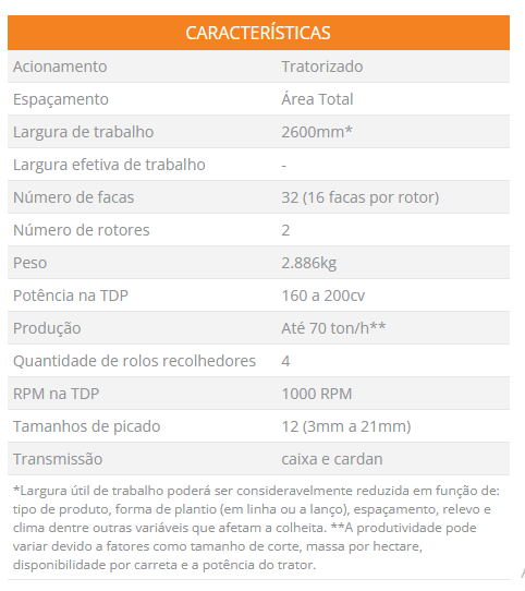 Descrição técnica: Colhedora de forragem em área total com acoplamento frontal e traseiro, com 1000 rpm na TDP. Máquina desenvolvida para colher e picar com precisão culturas forrageiras (milho, sorgo, capim, cana, aveia e outras similares), independente de linha de plantio, Composta por uma plataforma com quatro tambores recolhedores frontais equipados com serras independentes, torre para acoplamento ao sistema de levante hidráulico de três pontos do trator, duas rodas, duas caixas alimentadoras com dois rolos frontais e dois traseiros, sendo um deles móvel, sistema de mudança de velocidade para variação do comprimento de corte, dois rotores picadores contendo 16 facas cada um, bica de descarga giratória com acionamento hidráulico e duplo direcionador de jato de produto picado.12 tamanhos de corte (3 a 21mm) e requer trator com potência de 160 a 200 cv e TDP a 1000 RPM.