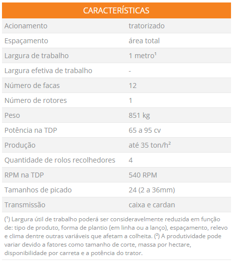 Descritivo técnico: Colhedora de forragem de área total para cultura de verão e inverno com 1m de largura máxima de trabalho, colheita de plantios a lanço e em linhas, independente de direção, colhe sistemas consorciados, especial para capins, milho e sorgo dentre outros tipos de forragens, tratorizado, equipado com dois tambores recolhedores com discos com facas de alta velocidade em cada tambor, transmissão por coroa e pinhão com caixa blindada, com 4 rolos internos sendo 02 rolos recolhedores, 01 liso e 01 móvel, rotor regulável com 12 facas em perfil “C”, processador de grãos +PRO removível, 06 lançadores, plataforma articulável, engrenagens com regulagem de tamanho de corte, 24 tamanhos de picado (2 a 36mm), afiador com pedra retangular, contrafaca do rotor fixa com quatro vidas, 02 limpadores por rotor, bica de saída dobrável, bica de saída em polietileno cross link com proteção interna, pé de apoio, cardan de acionamento, dedos alinhadores, tambores recolhedores, tombador, pistão de giro da bica, quebra-jato, caixa de ferramentas, caixa da plataforma lubrificada por graxa à base lítio, cardan de acionamento do rotor e rolos, transmissão por caixa e cardan, caixa articulada com a contra-faca ajustável, comando hidráulico da bica, rotação requerida na TDP de 540 RPM, potência requerida na TDPde 65 a 95 cv.