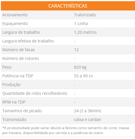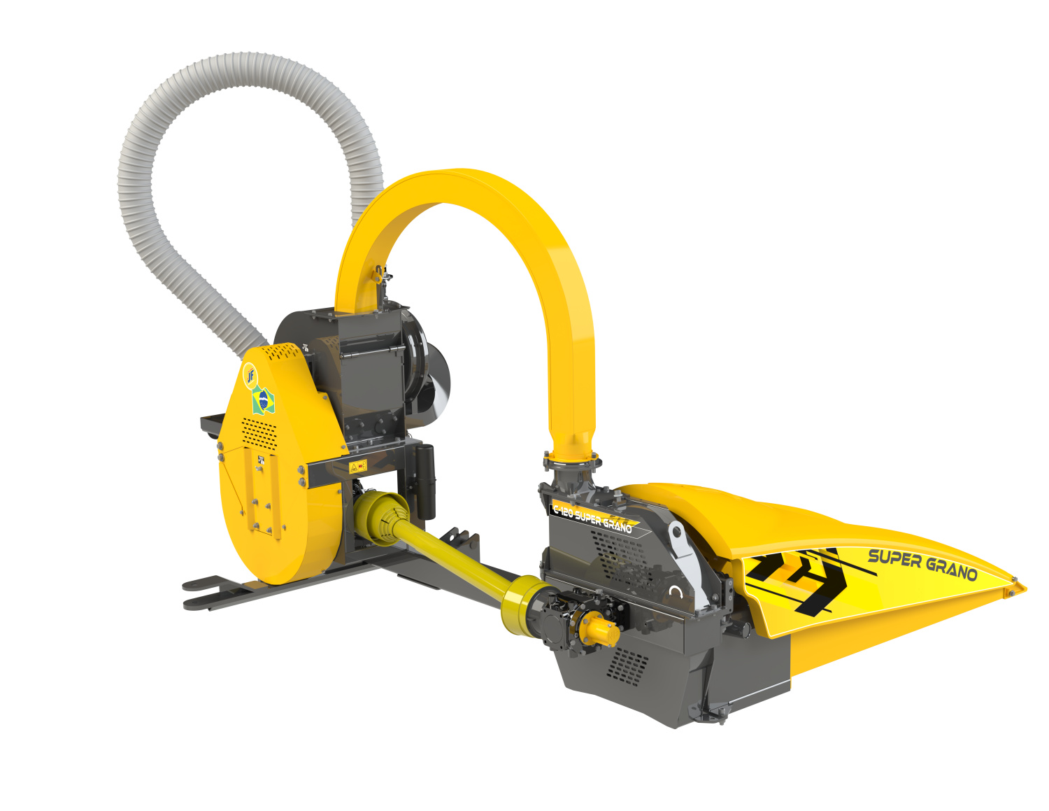 Colhedora de uma linha, composta por dois alinhadores, uma caixa alimentadora com dois rolos frontais e dois traseiros, sendo um deles móvel, com sistema de mudança de velocidade para variação do comprimento de corte, carenagem, rotor picador contendo 12 facas, braço lateral para acoplamento ao sistema de levante hidráulico de três pontos do trator, sistema de transmissão por cardan, rotor triturador contendo 36 martelos móveis, caixa de sucção, ventilador e tubo flexível para descarga. Esta máquina foi desenvolvida para colher e triturar milho (pés inteiros com as espigas) plantado em linha, com umidade de 12 a 14% , produzindo rolão para alimentação animal (bovinos, suinos, ovinos, etc). Para garantir o melhor desempenho da JF C120 SUPER GRANO, recomenda-se o uso de um trator categoria 2 com potência de 55 a 90 cv na tomada de força (540 rpm) e embreagem dupla com acionamento independente (TDP e motor).
