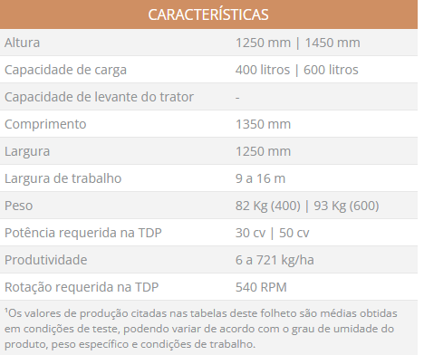 Distribuidor monodisco com capacidade para 400 e 600 litros, tratorizado, estrutura em aço, reservatório em polietileno, equipado com disco e rotor dotado de 4 pás com alcance de 9 a 16 metros, agitador com cone, agitador especial para calcário, controle de dosagem, prato dosador ajustável por alavanca, acionamento por cardan. Rotação requerida na TDP de 540 RPM e potência requerida na TDP de 30 cv para volume de 400 litros e 50 cv para volume de 600 litros.