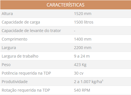 Distribuidor de duplo disco com capacidade para 1500 litros e tecnologia Rotaflow, tratorizado, estrutura em aço, reservatório em polietileno, equipado com mecanismo de transmissão por caixa de engrenagens totalmente conjugadas, alcance de lançamento de 9 a 24 metros, discos planos em aço inoxidável, sistema de calibração em aço carbono, pás ajustáveis com pinos, com opções de ajuste para distribuição em borda, vazão de distribuição regulável, sistema de distribuição para terrenos planos e inclinados, portas dosadoras controladas por sistema hidráulico, tubos e bandejas de calibração inclusos, caixa de graduação inclusa, funil de verificação de taxa de aplicação incluso, chapa defletora opcional, acionamento por cardan, potência requerida a partir de 30 cv na TDP e rotação requerida de 540 RPM na TDP.