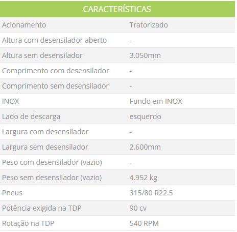 Contamos com a porta dosadora com abertura hidráulica, transmissão por meio de planetário com engrenagens banhadas a óleo; sistema de rodagem com quatro rodas e suspensão por feixe de molas; cabeçalho de acoplamento ao trator com altura de engate regulável e sistema de pesagem eletrônico de precisão, com balança composta por quatro células de carga e indicador sonoro.