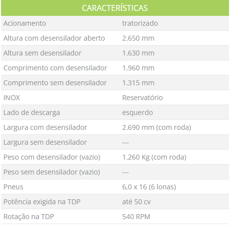 Vagão misturador tracionado com capacidade para 2m3, em aço inoxidável, equipado com rosca misturadora, braço desensilador com tambor de desensilar com sistema de facas cruzadas substituíveis de forma independente, fresa com sensor de pressão, conjunto de rosca de descarga com mancal e rosca removíveis, desensilador com balanceamento dinâmico, rótula e rolamento autocompensador para autoalinhamento do eixo do desensilador (fresa), tanque de óleo blindado, proteção traseira do rolo desensilador, rosca para descarga direta no cocho. Transmissão através de caixa de engrenagens banhada a óleo e por correntes totalmente dimensionadas para resistir esforços, acionamento do desensilador por bomba hidráulica e articulação por pistão, rodas acionadas pelo hidráulico do trator, potência requerida a partir de 50 cv.