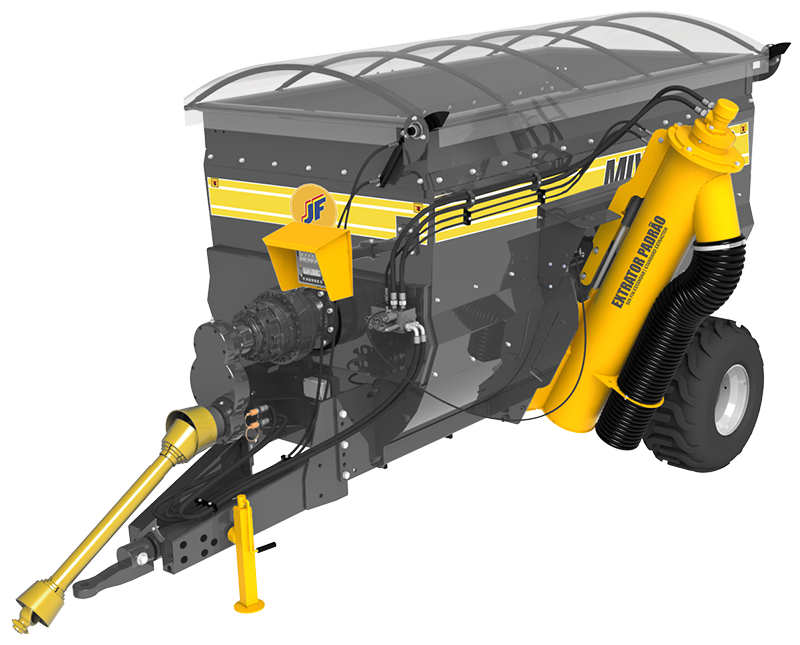 Vagão Misturador tracionado com capacidade para 4m³ e 6m³, destinado para uso de sal e concentrado, equipamento com tanque de mistura, rosca misturadora e chupim em aço inoxidável, descarga em sistema de mangueira flexível padrão, mangueira flexível estendida (opcional), descarga por esteira para silagem (opcional), sistema de mistura por pás, pás com paleta de borracha, planetário com resistência para mistura de materiais minerais no trato animal, proteção do cardan, chupim para descarga direta no cocho, estrutura articulável coberta com lona, macaco, compartimento traseiro para adição de ingredientes na mistura. Transmissão por cardan através de redutores, joystick controlador de fluxo, pneus de alta flutuação, sistema de pesagem por balança com transferência de dados para pen-drive/computador, rotação requerida de 540 RPM na TDP, potência requerida a partir de 50 cv na TDP.