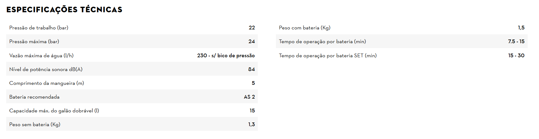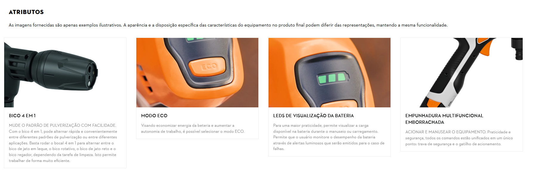 Com uma pressão máxima de 24 bar e pesando apenas 1,3 kg, a RCA 20 é perfeita para limpar móveis de jardim, bicicletas, churrasqueiras, ares condicionados e equipamentos de lazer com facilidade podendo ser manuseada apenas com uma mão. O bico 4 em 1 leque, turbo, regar e jato permite diferentes aplicações. Entre os acessórios que acompanham a RCA 20 STIHL estão: bico 4 em 1, extensão da lança de pulverização, mangueiras de aspiração com filtro, recipiente de transporte de água e bico de espuma.