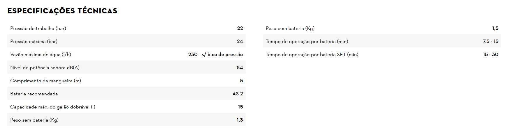 A lavadora de pressão a bateria RCA 20 STIHL é a solução perfeita para você. Este modelo vem com um kit completo, incluindo 2 baterias AS 2 e um carregador AL 1. Compacta e leve, é ideal para tarefas de limpeza em casa e para uso móvel em qualquer lugar. Alimentada por baterias de íons de lítio do sistema STIHL AS, a RCA 20 funciona sem a necessidade de conexões elétricas ou de água. Utilize água de um balde ou do recipiente de transporte de água fornecido, se não houver uma ligação de água próxima. Com uma pressão máxima de 24 bar e pesando apenas 1,3 kg, a RCA 20 é perfeita para limpar móveis de jardim, bicicletas, ares condicionados, churrasqueiras e equipamentos de lazer com facilidade. O bico 4 em 1 permite uma rápida mudança entre diferentes aplicações entre leque, turbo, regar e jato. Todos os acessórios, incluindo o bico 4 em 1, extensão da lança de pulverização, mangueiras de aspiração com filtro, recipiente de transporte de água e bico de detergente, podem ser armazenados na bolsa de armazenagem que acompanha o RCA 20, garantindo que tudo esteja sempre à mão para uma limpeza rápida. Uma funcionalidade interessante do RCA 20 é a função ECO, que visa a economia de energia e o aumento da autonomia de trabalho. Também possui visor LED de carga e diagnóstico, permitindo que o usuário monitore o desempenho da bateria e receba alertas em caso de falhas.