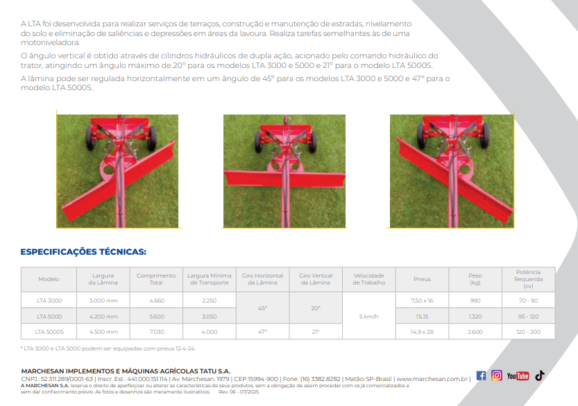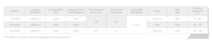 A LTA foi desenvolvida para realizar serviços de terraços, construção e manutenção de estradas, nivelamento do solo e eliminação de saliências e depressões em áreas da lavoura. Realiza tarefas semelhantes às de uma motoniveladora. O ângulo vertical é obtido através de cilindros hidráulicos de dupla ação, acionado pelo comando hidráulico do trator, atingindo um ângulo máximo de 20º.