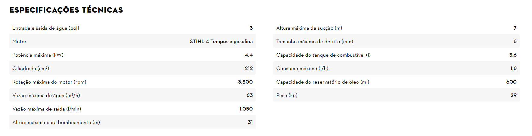 A Motobomba WP 600 da STIHL é uma ferramenta de alta performance, especialmente projetada para a transposição eficiente de água em diversos ambientes, como na agricultura e na construção civil. Este equipamento robusto é capaz de transferir até 1.000 litros de água por minuto, com uma vazão máxima de 63 m³/h, a uma altura máxima de sucção de 7 metros e de bombeamento de 31 metros. Possui um motor STIHL EHC 605 de 4 tempos a gasolina, com 6 HP de potência, garantindo confiabilidade e força no desempenho. Além disso, a motobomba vem com um quadro de sustentação resistente, protegendo o motor e a bomba contra impactos, e um filtro de sucção que impede a contaminação por partículas, assegurando durabilidade e eficácia. Fácil de operar, a Motobomba WP 600 é uma escolha excelente para quem busca desempenho superior em transposição de água.