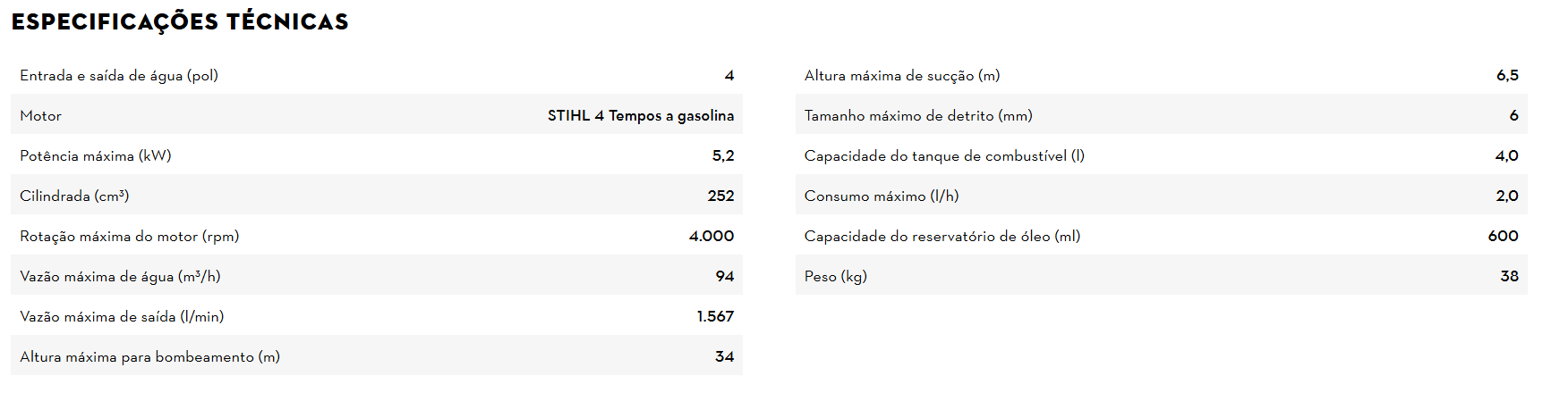 A Motobomba WP 900 da STIHL é uma ferramenta poderosa para transposição de água, especialmente útil na agricultura e na construção civil. Equipada com um motor STIHL EHC 705 de 4 tempos a gasolina de 7 HP, é capaz de transferir até 1.000 litros de água a cada 40 segundos. Com uma vazão máxima de 94 m³/h, tem altura máxima de sucção de 6,5 m e altura máxima de bombeamento de 34 m. Possui um quadro de sustentação robusto, conexões fáceis para mangueiras e filtro de sucção para proteção contra partículas.