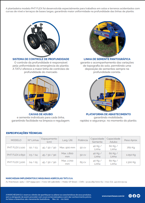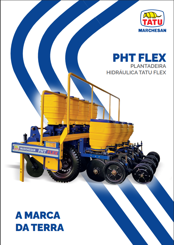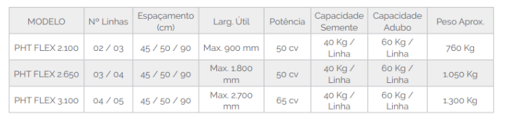 A plantadeira PHT FLEX é fornecida na versão de acoplamento nos três pontos do trator, com chassi de 2200, 2700 e 3200 mm com disponibilidade para troca de espaçamentos das linhas. Equipada com: caixas de adubo individuais para cada linha e caixa de semente com engate rápido que facilita a limpeza e regulagem.