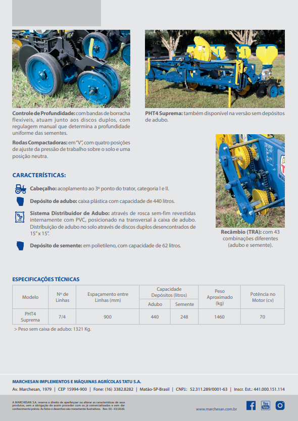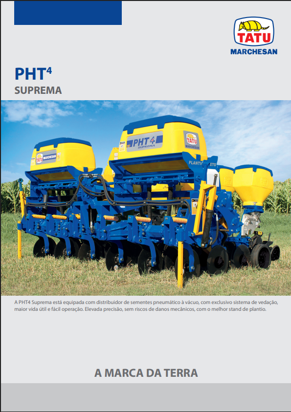 A PHT4 Suprema está equipada com distribuidor de sementes pneumático à vácuo, com exclusivo sistema de vedação, maior vida útil e fácil operação. Elevada precisão, sem riscos de danos mecânicos, com o melhor stand de plantio.PHT4 SUPREMA – Plantadeira Hidráulica Tatu