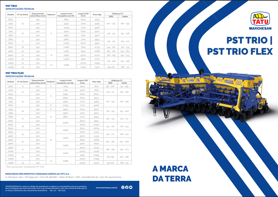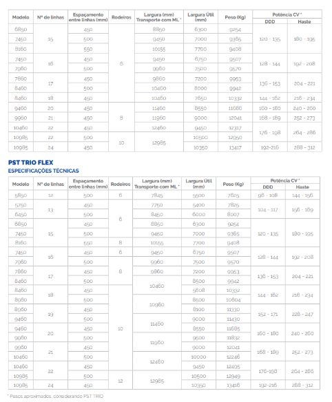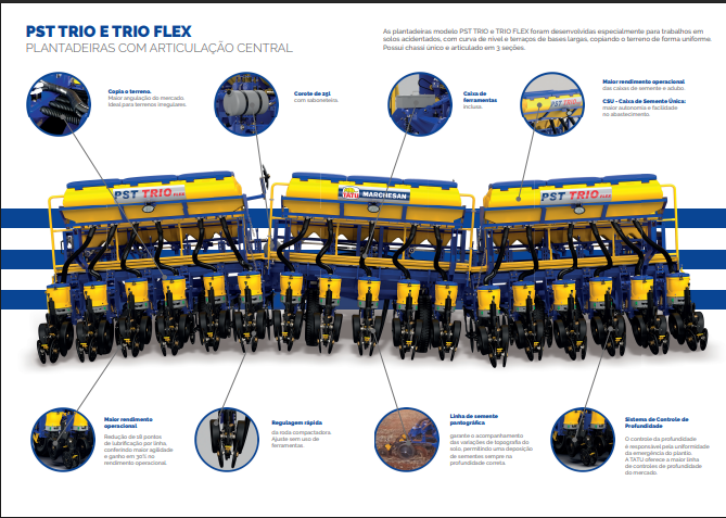 As plantadeiras modelos PST TRIO e PST TRIO FLEX foram desenvolvidas especialmente para trabalhos em terrenos acidentados com curvas de nível e terraços de bases largas, garantindo maior uniformidade na profundidade das linhas de plantio. Possuem chassi único e articulado em três seções, com modelos de 12 a 24 linhas de plantio.