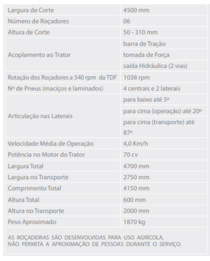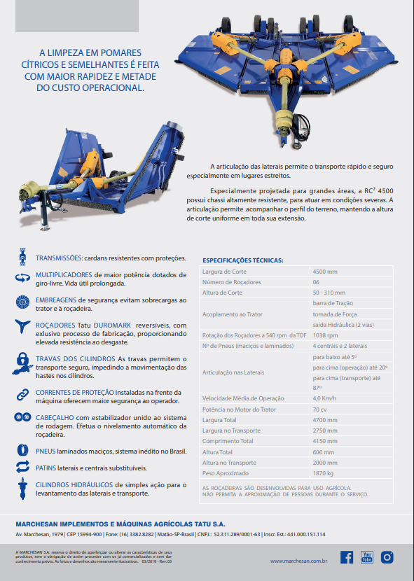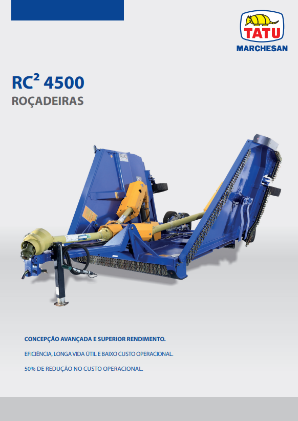 Especialmente projetada para grandes áreas, a RC² 4500 possui chassi altamente resistente, para atuar em condições severas. A articulação permite acompanhar o perfil do terreno, mantendo a altura de corte uniforme em toda sua extensão.