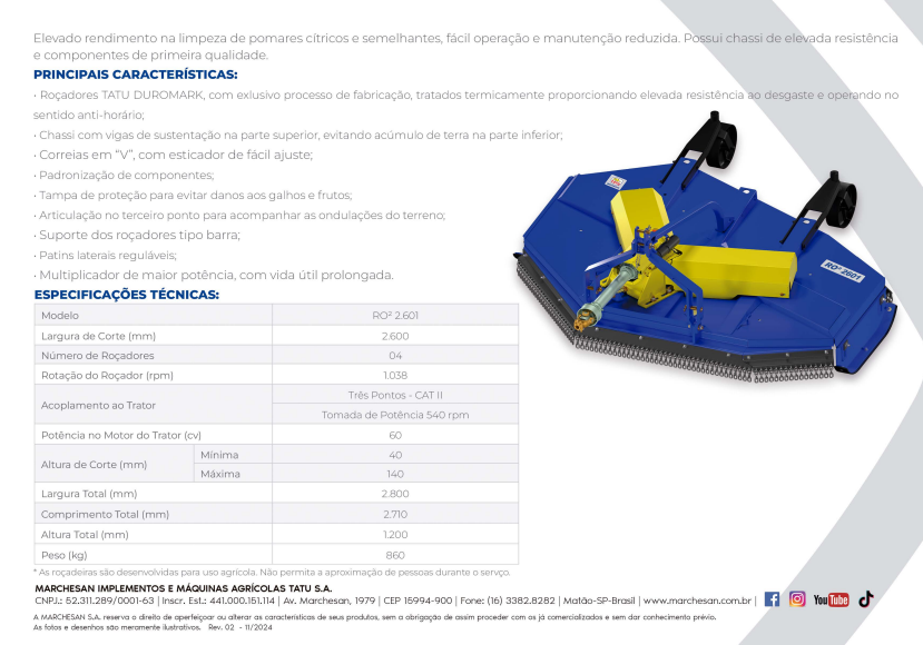 Elevado rendimento na limpeza de pomares cítricos e semelhantes, fácil operação e manutenção reduzida. Possui chassi de elevada resistência e componentes de primeira qualidade.
