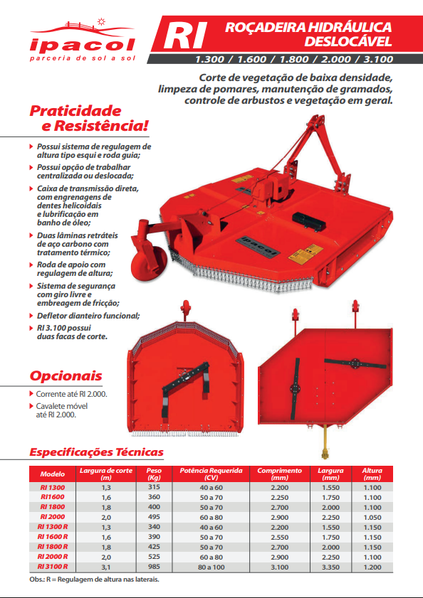 Corte de vegetação de baixa densidade, limpeza de pomares, manutenção de gramados, controle de arbustos e vegetação em geral.