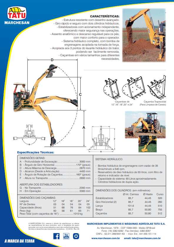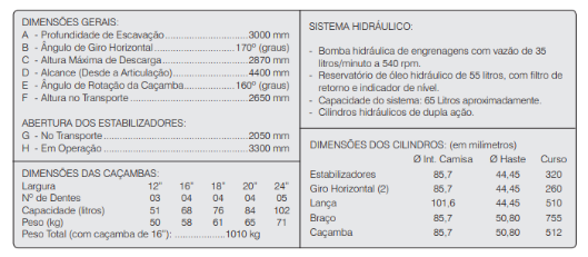 – Estrutura resistente com desenho avançado; – Giro rápido e seguro com dois cilindros hidráulicos; – Estabilizadores com acionamento independente, oferecendo maior segurança nas operações; – Assento anatômico e descanso regulável para os pés, com maior conforto para o operador; – Sistema hidráulico completo, com bomba de engrenagens acoplada na tomada de força; – Acoplada aos 3 pontos do levante hidráulico do trator, podendo ser facilmente removida; – Caçambas em vários tamanhos para diferentes necessidades.