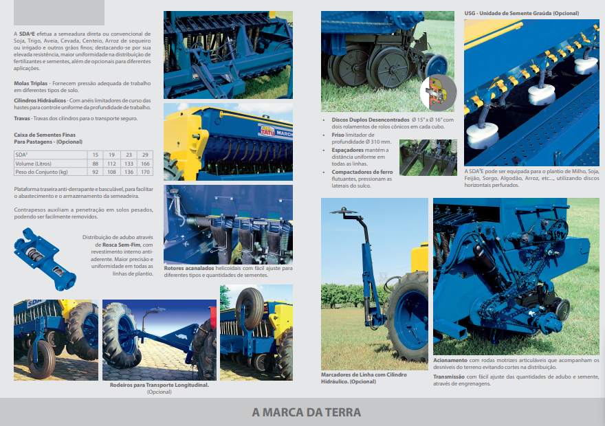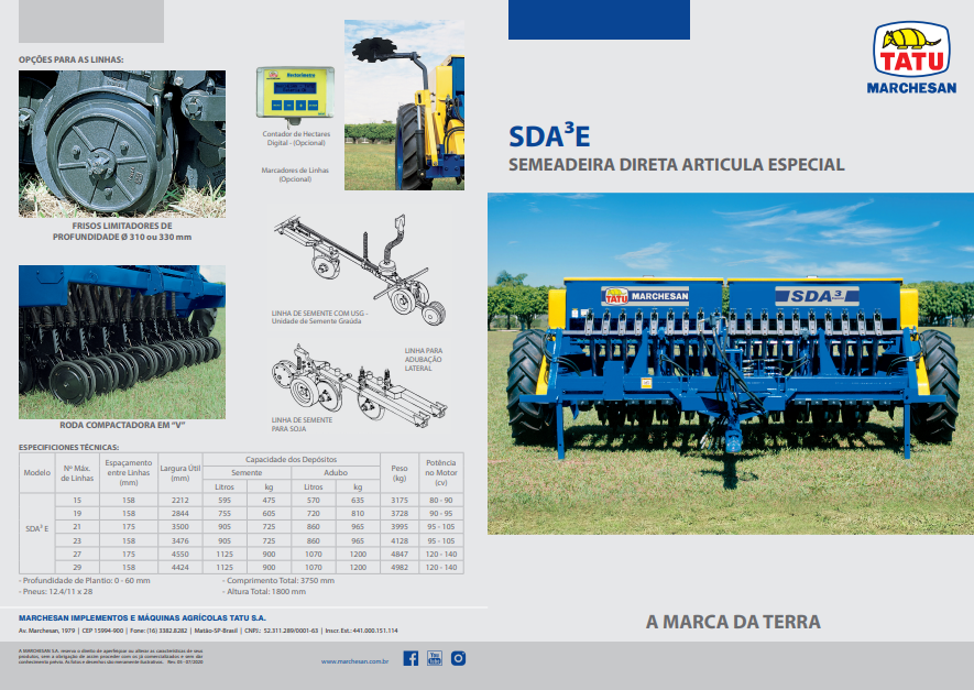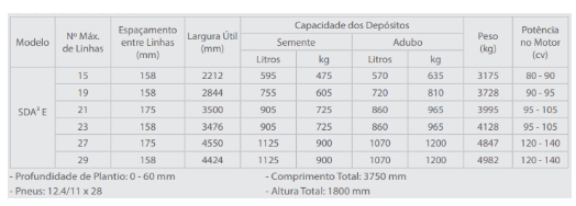 A SDA3E efetua a semeadura direta ou convencional de Soja, Trigo, Aveia, Cevada, Centeio, Arroz de sequeiro ou irrigado e outros grãos finos; destacando-se por sua elevada resistência, maior uniformidade na distribuição de fertilizantes e sementes, além de opcionais para diferentes aplicações.