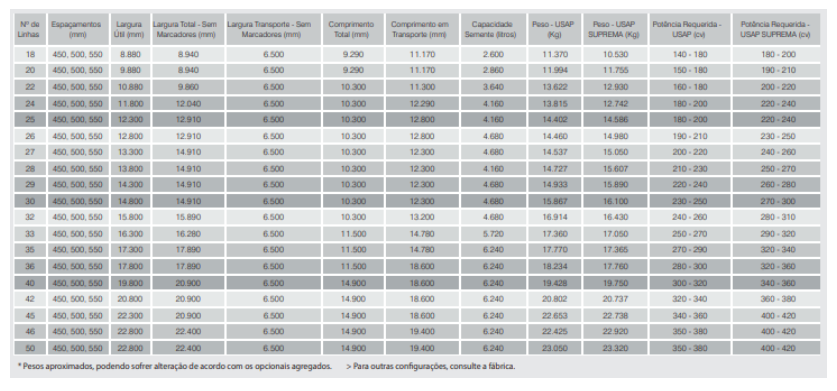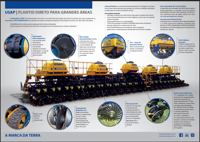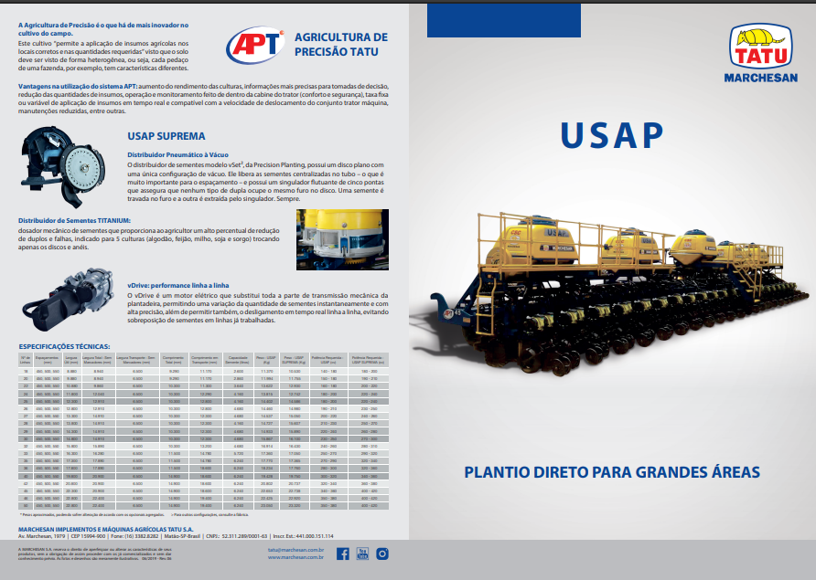 A plantadeira USAP foi desenvolvida com base na reconhecida tecnologia das linhas de plantio que vêm equipando as plantadeiras TATU MARCHESAN, testadas e amplamente utilizadas no plantio direto. USAP SUPREMA: Equipada com distribuidores de semente à vácuo. USAP CSC: Equipada com caixa de semente central, proporcionando maior autonomia e facilidade no abastecimento de sementes. USAP ADUBO E SEMENTE: Distribuição de adubo e semente. Disponível até 30 linhas.