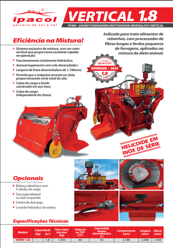 Indicado para trato alimentar de rebanhos menores, com processador de fibras longas e fardos pequenos de forragens aplicados na mistura da dieta animal.