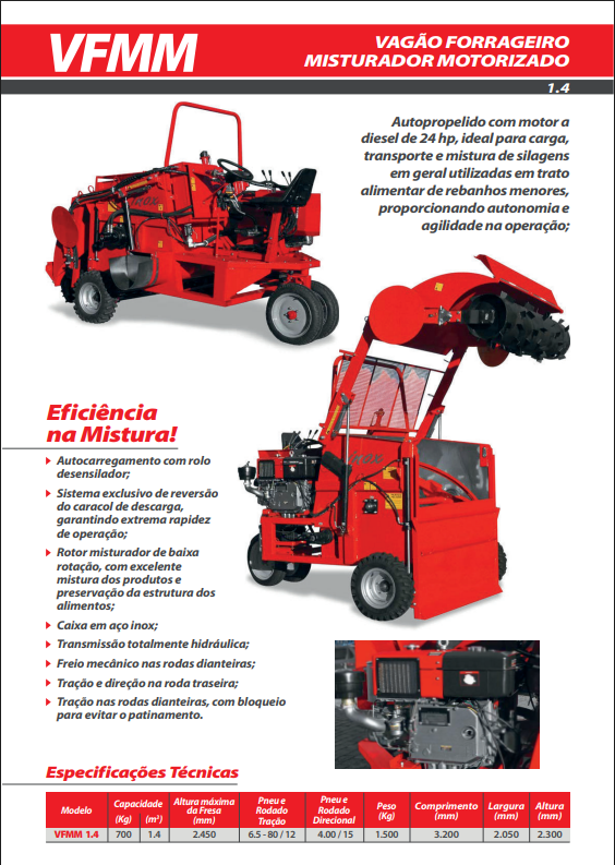 Autopropelido com motor a diesel de 24 hp, ideal para carga, transporte e mistura de silagens em geral utilizadas em trato alimentar de rebanhos menores, proporcionando autonomia e agilidade na operação.